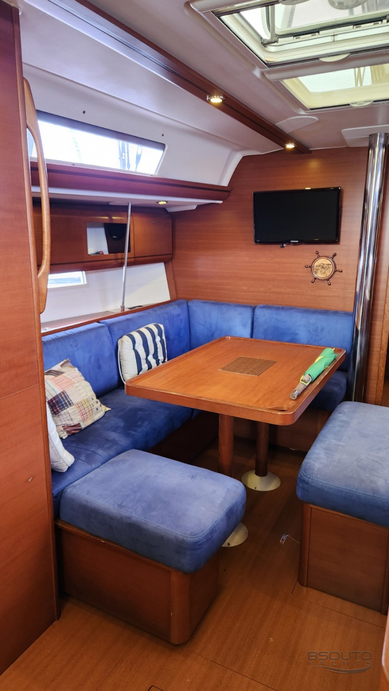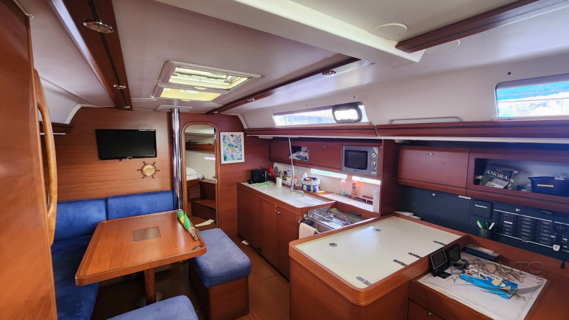 MESA DE CENTRO COM CAPACIDADE DE 6 PESSOAS FOLGADAS E AMPLOS ARMÁRIOS LATERAIS TANTO SOBRE A COZINHA COMO A BOMBORDO |