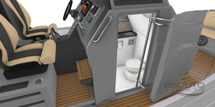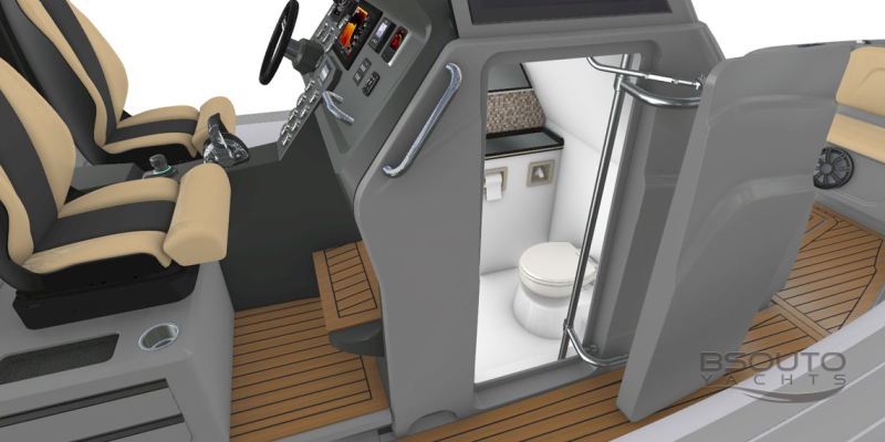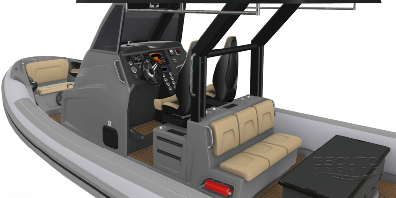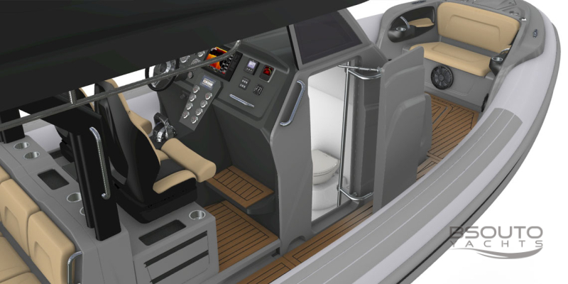 Este novo barco inflável possui um excelente banheiro sob a console de pilotagem, bancos individuais para piloto e copiloto fabricados em fibra de carbono, com estofamentos injetados sem costuras que não encharcam quando molhados e ainda são montados com um sistema Anti-Shock que amortecem o impacto nas ondas protegendo assim a coluna do piloto.