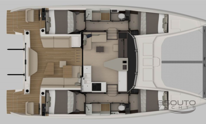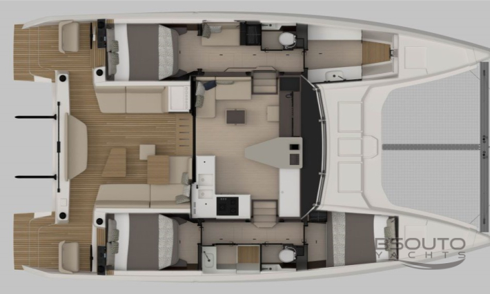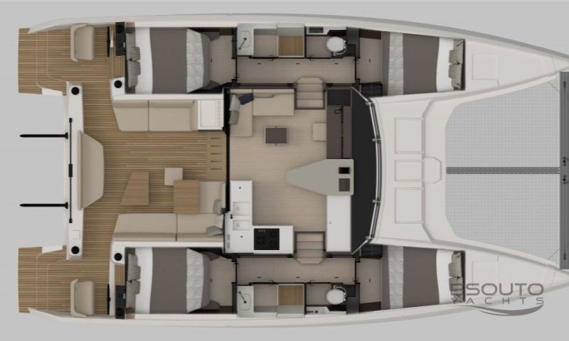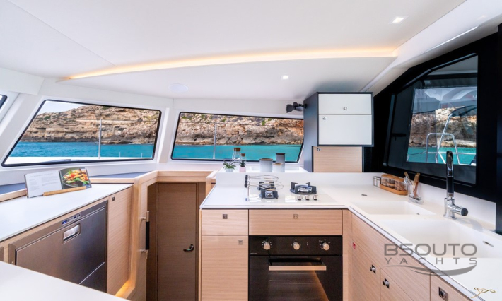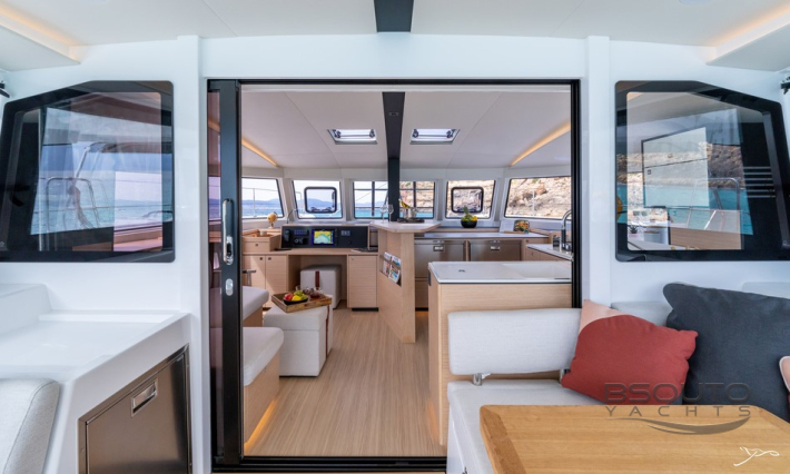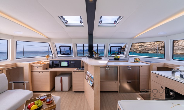 O conceito aberto, um elemento fundamental do DNA da Nautitech, cria uma espaçosa sala de estar onde o salão e o cockpit são um só. Um layout projetado em torno de um conceito original de bar que coloca convívio e fluidez no coração da experiência Nautitech.