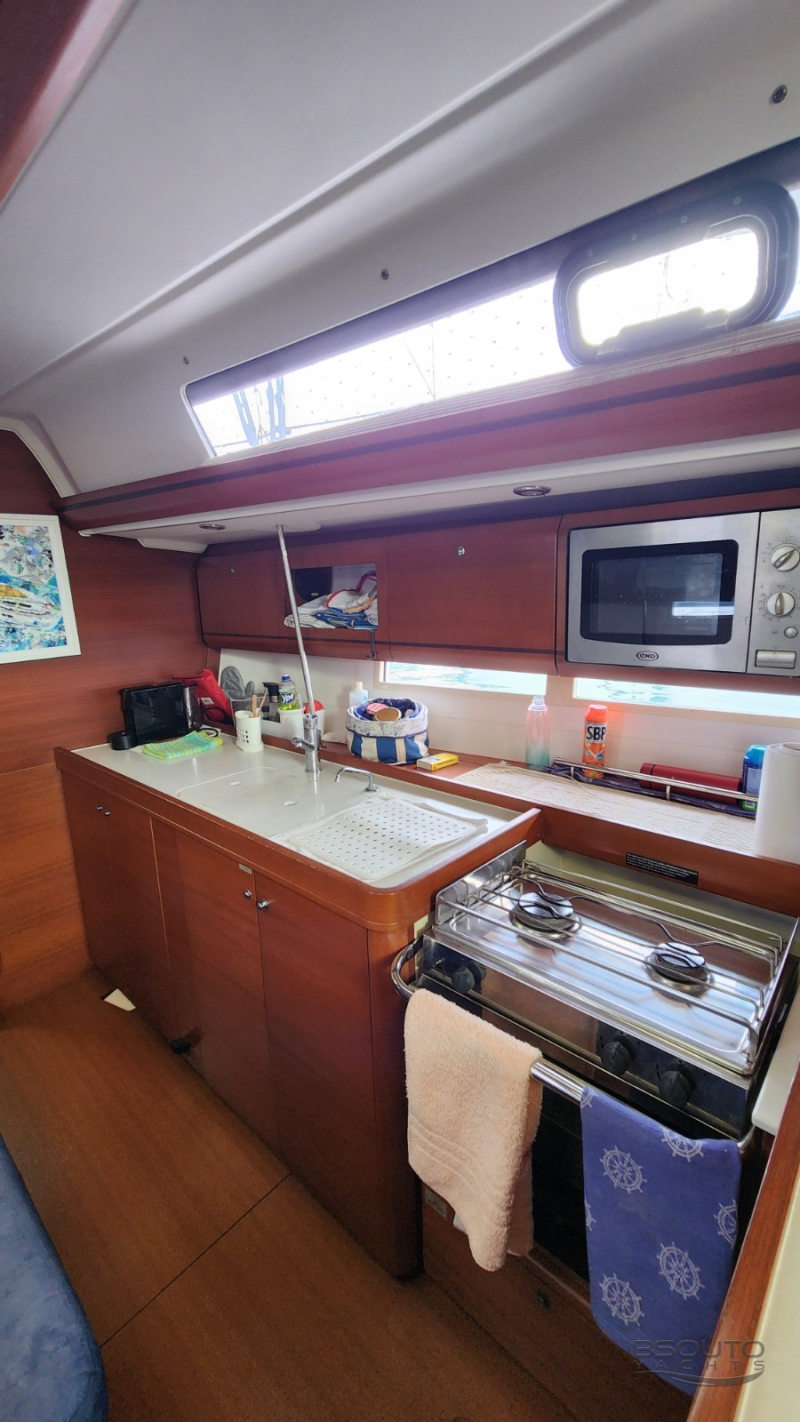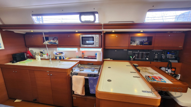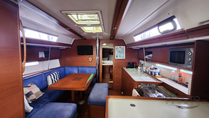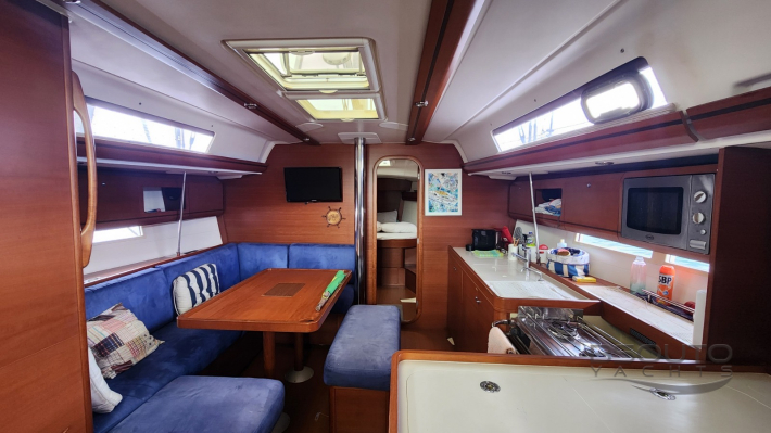 MESA DE CENTRO COM CAPACIDADE DE 6 PESSOAS FOLGADAS E AMPLOS ARMÁRIOS LATERAIS TANTO SOBRE A COZINHA COMO A BOMBORDO |